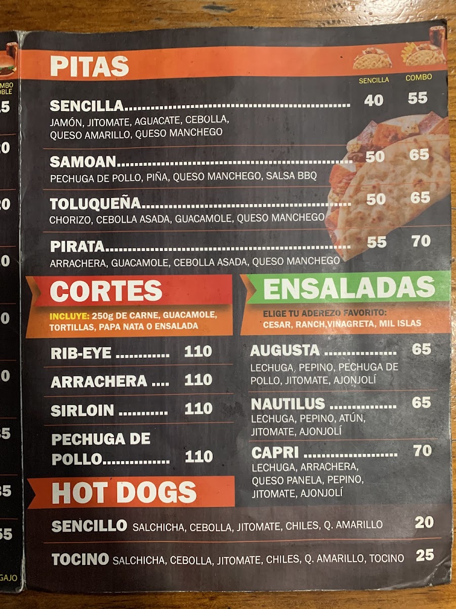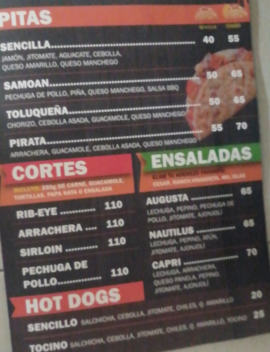 Pita: jamon, queso amarillo, queso manchego, aguacate, cebolla asada, jitomate, papas y refresco .