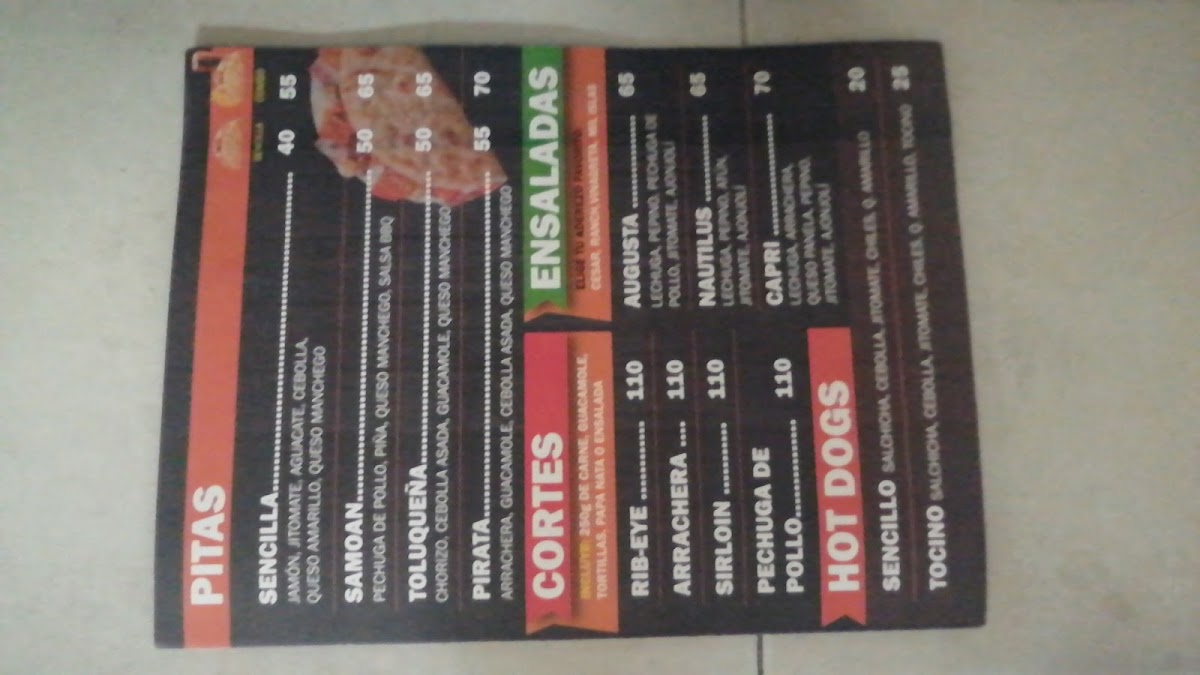 Pita pirata: arrachera, queso manchego, cebolla asada, guacamole. Papas y refresco.